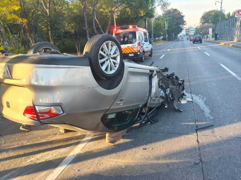 El golpe fue tan fuerte que uno de los neumáticos salió volando de la unidad y terminaron con las llantas para arriba en medio de esta vialidad con sentido al centro.
