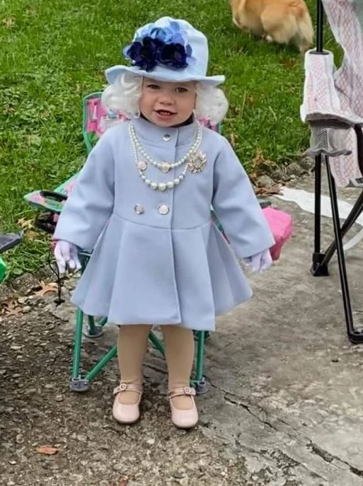 El disfraz de la niña consistía en un abrigo azul, una peluca de cabello blanco, un sombrero y collares de perlas como la reina, incluso llevaba un par de perros corgis a su lado, tal como el monarca.