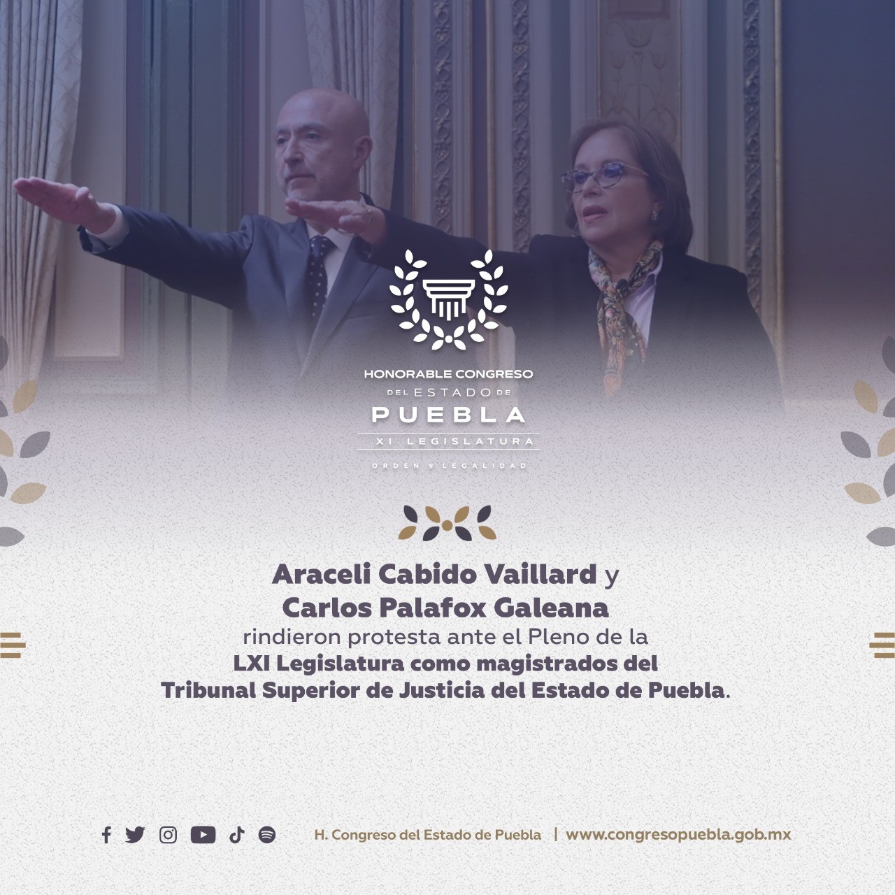 En sesión ordinaria de la LXI Legislatura del Congreso del Estado, las y los diputados, nombraron magistrados propietarios del Tribunal Superior de Justicia del Estado de Puebla a Araceli Cabido Vaillard y a Carlos Palafox Galeana quienes rindieron protesta ante el Pleno para iniciar sus funciones.