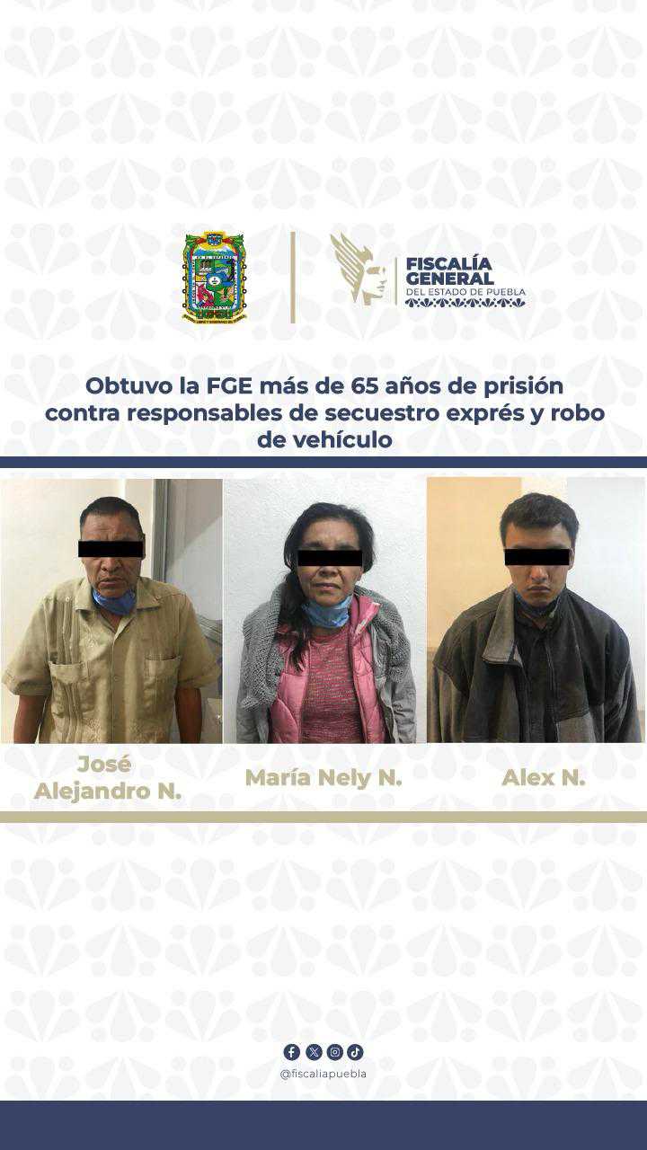La Fiscalía General del Estado demostró la responsabilidad de José Alejandro N., María Nely N., y Alex N., en los delitos de secuestro exprés agravado y robo de vehículo agravado, por lo que fueron sentenciados cada uno a más de 65 años de prisión.