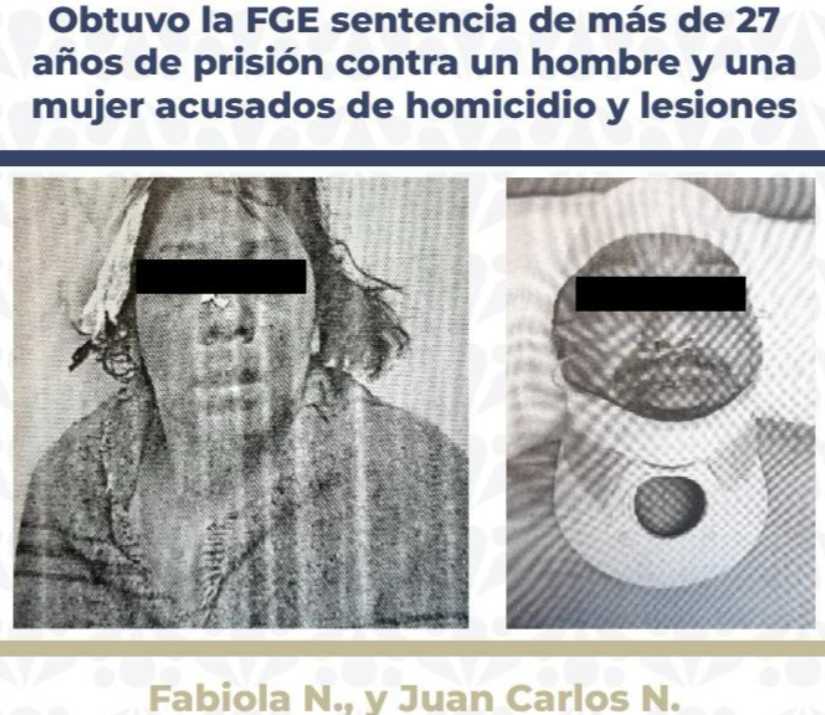 La Fiscalía General del Estado obtuvo una sentencia condenatoria de más de 27 años de prisión en contra de Fabiola N., y Juan Carlos N., luego de acreditarse de manera plena su responsabilidad penal en los delitos de homicidio y lesiones calificadas. La resolución judicial se logró tras la integración y desahogo de evidencias periciales, técnicas y científicas que fortalecieron la teoría del caso presentada por el Ministerio Público, permitiendo demostrar la participación activa de los acusados.