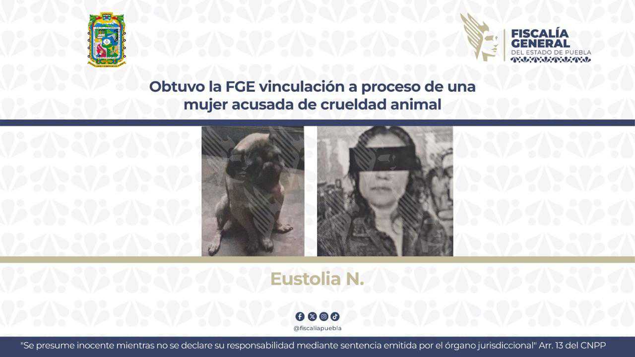 La Fiscalía General del Estado de Puebla acreditó con datos de prueba la posible participación de Eustolia N., en delitos contra los animales en su modalidad de crueldad.