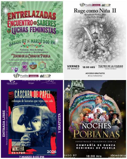 El Teatro de la Ciudad presenta el poemario “Ruge como niña”, la cita es a las 18 horas, la entrada es libre. También este viernes, la Capilla del Arte UDLAP, ubicada en la 2 norte # 6, presenta la proyección de cortometrajes “Ellas Narran, voces diversas desde la feminidad”, a partir de las 18:30 horas.