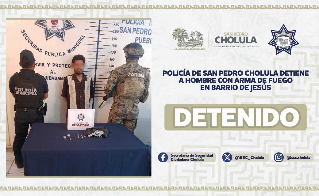 Como resultado de una pronta intervención, elementos de la Secretaría de Seguridad Ciudadana de San Pedro Cholula (SSC Cholula), detuvieron a Eduardo “N” de 28 años por portación ilegal de arma de fuego, en el Barrio de Jesús Tlatempa.
