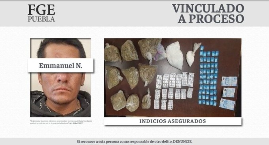 El pasado 17 de febrero de 2022 en un inmueble de la junta auxiliar de Atencingo detuvo a Emmanuel N. en posesión de 53 bolsas con sustancia conocida como cristal, 9 bolsas con hierba verde con las características similares de la marihuana y 15 blísteres con 221 pastillas de medicamento controlado.