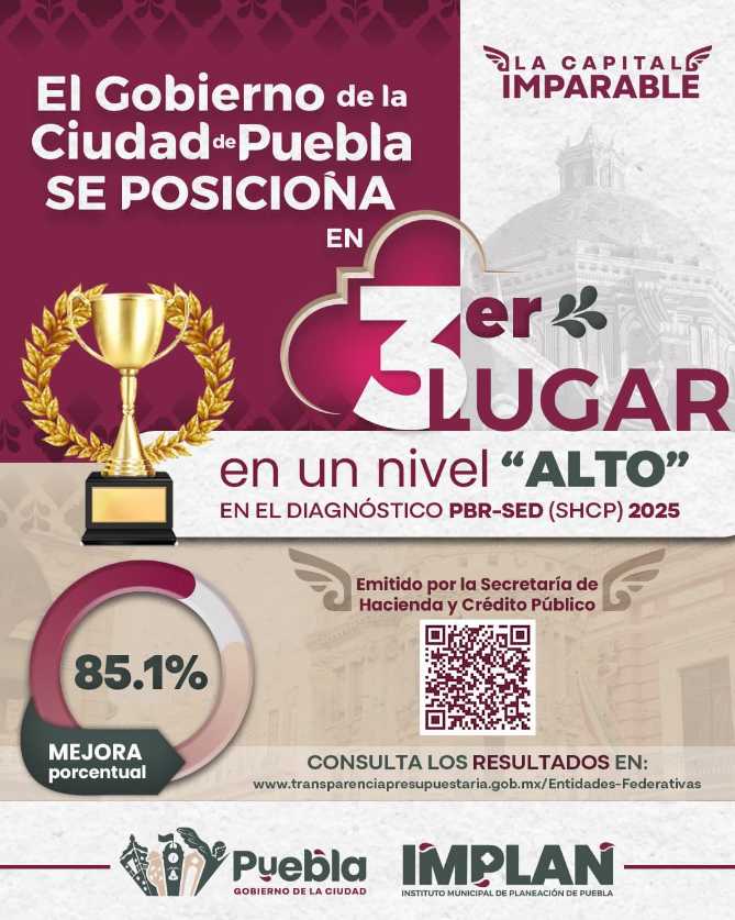 La Secretaría de Hacienda y Crédito Público (SHCP) dio a conocer los resultados del Diagnóstico del Presupuesto Basado en Resultados y del Sistema de Evaluación del Desempeño (PbR-SED) 2025. En este informe, el Gobierno Municipal de Puebla, encabezado por el alcalde Pepe Chedraui, obtuvo el tercer lugar a nivel nacional con una calificación de 85.1%, manteniéndose en el nivel de desempeño “Alto”.