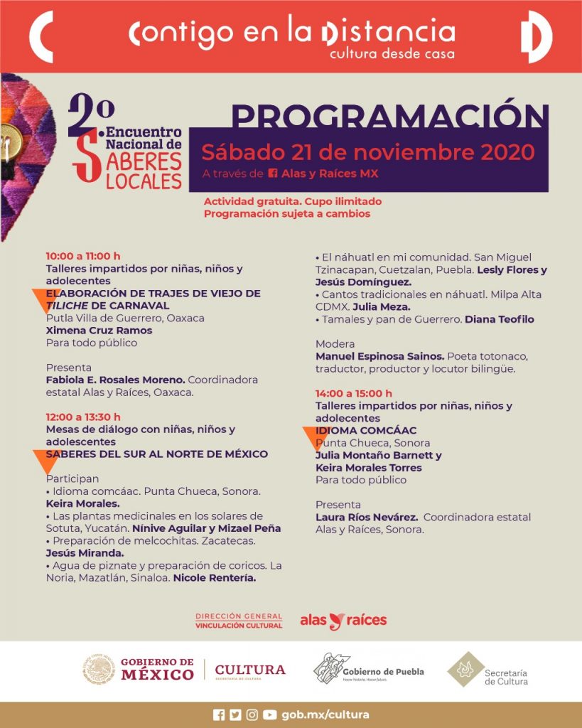 Este segundo encuentro, organizado por la Secretaría de Cultura del Gobierno de México, a través del programa Alas y Raíces, está compuesto por conversatorios virtuales en los que habrá mesas de diálogo y talleres en vivo para interactuar de manera directa con las y los interesados en aprender diversas técnicas.
