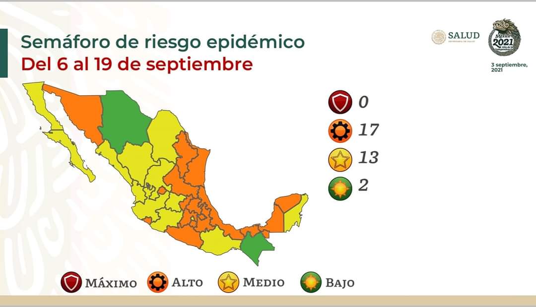 Del 6 al 19 de septiembre, ninguna entidad federativa estará en rojo de riesgo máximo del Semáforo de Riesgo Epidémico; dos estarán en verde, 13 en amarillo y 17 en naranja, informa la Secretaría de Salud conforme a la evaluación del Lineamiento para la Estimación de Riesgos del Semáforo por Regiones COVID-19.