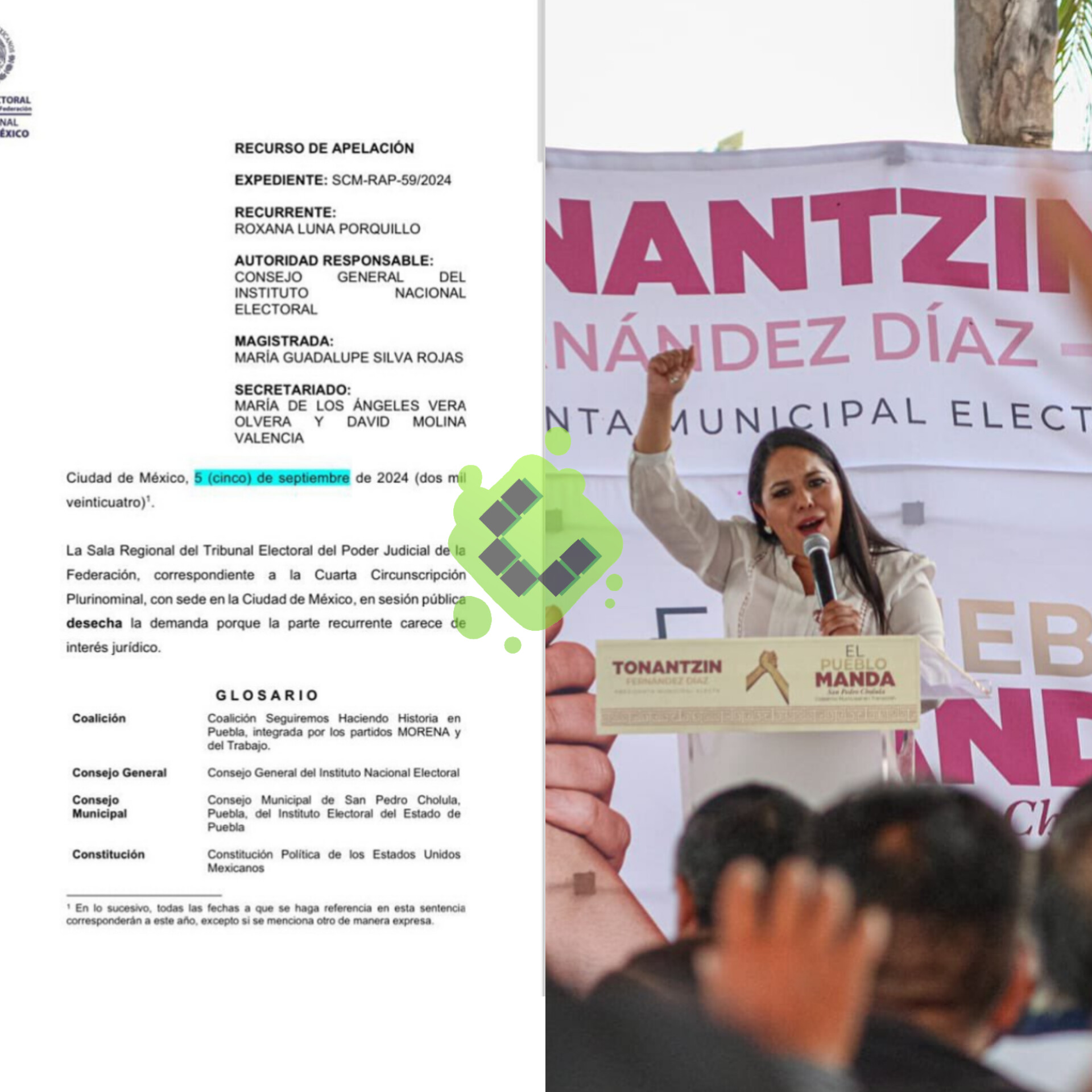 En sesión pública de la Sala Regional del Tribunal Electoral del Poder Judicial de la Federación (TEPJF), se desechó la queja presentada por la excandidata del PRIANRD a la presidencia municipal de San Pedro Cholula, Roxana Luna Porquillo, consignado en Recurso de Apelación SCM-RAP-59/2024.