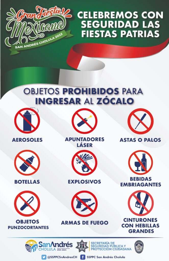 Con la finalidad de evitar el ingreso de artículos que pongan en riesgo la integridad física de quienes asistan al Zócalo, se instalarán arcos de seguridad y detectores de metal. Debido a lo anterior, queda prohibido el ingreso de cintos con hebillas grandes, botellas, bebidas embriagantes, objetos punzocortantes, explosivos, armas de fuego, astas o palos, aerosoles y apuntadores láser.