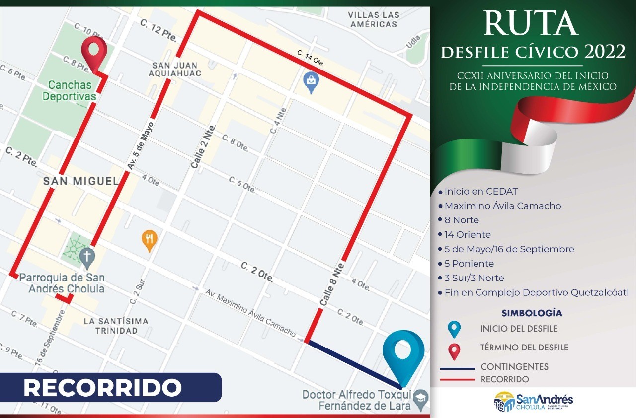 Referente al desfile conmemorativo al 212 Aniversario del inicio de la Independencia en México, se informa que los contingentes comenzarán su trayecto a las 9:00 horas sobre la calle Maximino Ávila Camacho a la altura del Centro Escolar Alfredo Toxqui Fernández de Lara; posteriormente, doblarán a la derecha sobre la calle 8 Norte hasta la calle 14 Oriente y darán vuelta a la izquierda en la Avenida 5 de Mayo; tomarán la calle 5 Poniente y enseguida girarán a la derecha en la calle 3 Norte; culminando el recorrido en la calle 8 Poniente.