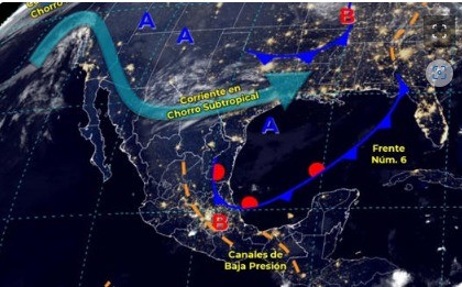 De acuerdo con el Servicio Meteorológico Nacional de Conagua, el frente número 6 adquirirá características cálidas en el oeste del Golfo de México y reforzará la entrada de humedad hacia el noreste del país, en interacción con un vórtice en niveles altos de la atmósfera y una vaguada polar, originarán lluvias fuertes a muy fuertes, descargas eléctricas, caída de granizo, rachas de viento de 50 a 70 km/h y posible formación de torbellinos y tornados en zonas de Coahuila, Nuevo León y Tamaulipas.