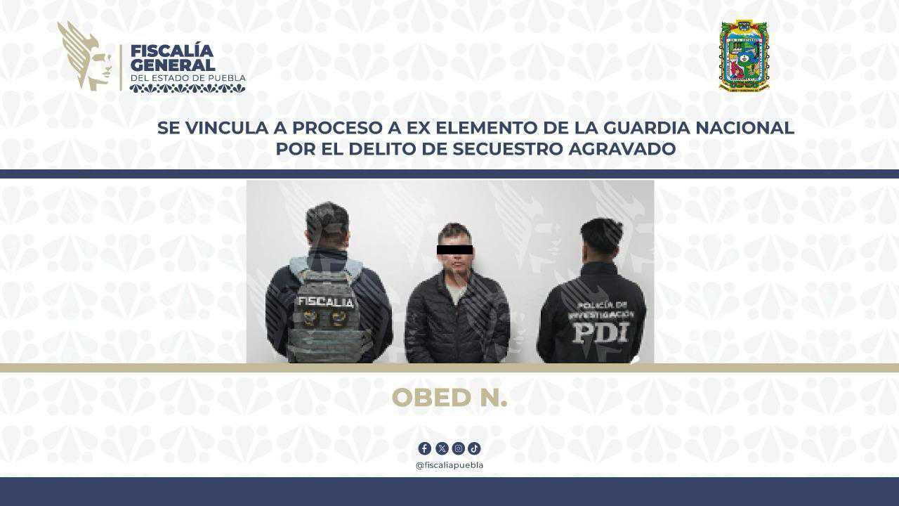 La Fiscalía General del Estado de Puebla obtuvo la vinculación a proceso y prisión preventiva oficiosa en contra de Obed N., ex elemento de la Guardia Nacional, por su probable responsabilidad en el delito de secuestro agravado extorsivo.