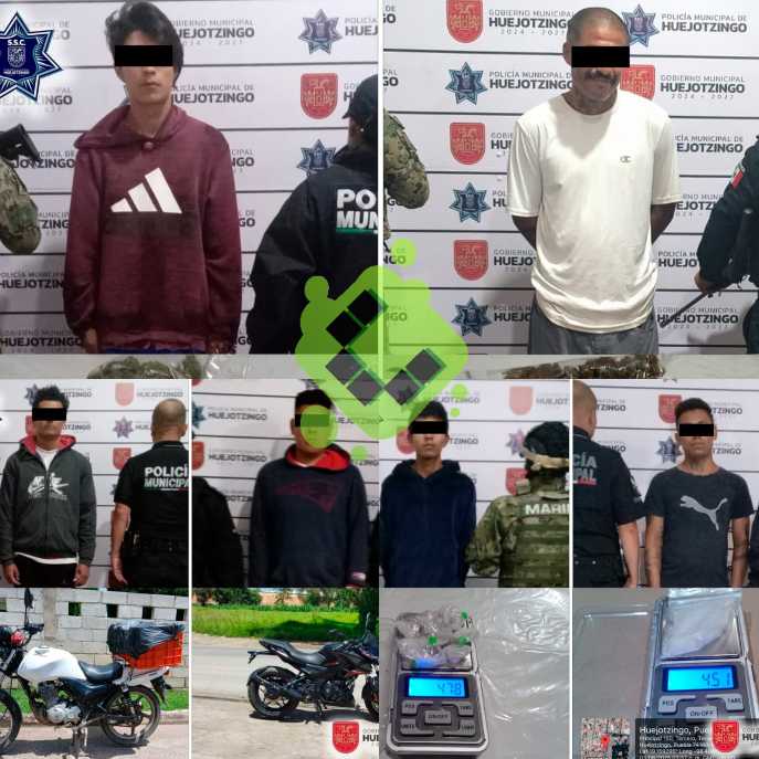 En operativos de prevención y vigilancia, se aseguraron a cuatro masculinos por presuntos delitos contra la salud. En la calle Mariano Matamoros, esquina con José María Morelos, del Cuarto Barrio, se detuvo a Alan Giovanni N., de 21 años, tras encontrarle 10 envoltorios con 4.78 gramos de una sustancia con características de la droga conocida como «cristal». En otro evento, en la calle San Ángel de la Junta Auxiliar de Santa Ana Xalmimilulco, se detuvo a Alexis N., de 27 años, con una bolsa de 4.51 gramos de una sustancia similar. Mientras que en el Boulevard Huejotzingo-Aeropuerto se aseguró a Alexander Israel N., de 21 años, con dos bolsas de 30 gramos de hierba verde con características de marihuana. Por último, en la calle Olmos, esquina con Avenida Las Moras, del fraccionamiento «Paseo de los Sauces», se detuvo a Roque Noé N., de 40 años, en posesión de seis bolsas de hierba verde con características propias de marihuana, una bolsa con material granulado similar al «cristal», un objeto punzocortante tipo daga, papel para liar y un objeto metálico con hierba seca. Todos los detenidos fueron puestos a disposición del Ministerio Público del Fuero Común para determinar su situación jurídica.