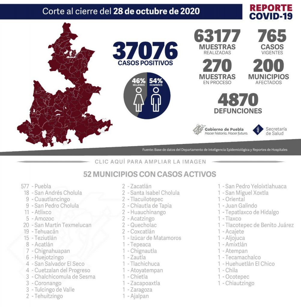 El titular de la Secretaría Salud, José Antonio Martínez García, confirmó acumulado de 37 mil 076 casos positivos de Covid-19 desde que inició la pandemia, con 765 casos activos a la fecha en 52 municipios