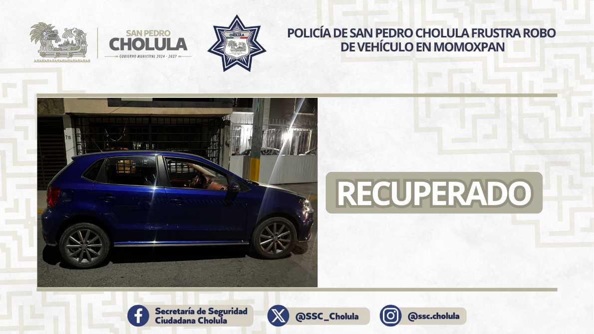 Gracias a una oportuna intervención, elementos de la Secretaría de Seguridad Ciudadana de San Pedro Cholula (SSC Cholula) lograron frustrar el robo de un vehículo en la junta auxiliar de Santiago Momoxpan.