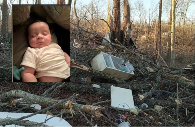 Un bebé de cuatro meses fue encontrado vivo después de ser succionado y arrastrado por un tornado en Tennessee, Estados Unidos.
