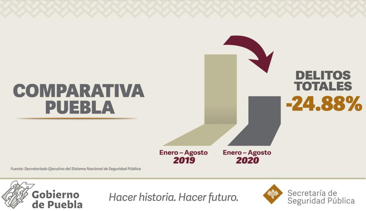 Como resultado de la estrategia de seguridad instruida por el gobernador Miguel Barbosa Huerta e implementada por la Secretaría de Seguridad Pública (SSP), la incidencia delictiva en Puebla disminuyó en 15 delitos de alto impacto, por lo que la entidad se ubicó seis lugares por debajo de la media nacional, de acuerdo con las cifras del Sistema Nacional de Seguridad Pública (SNSP).