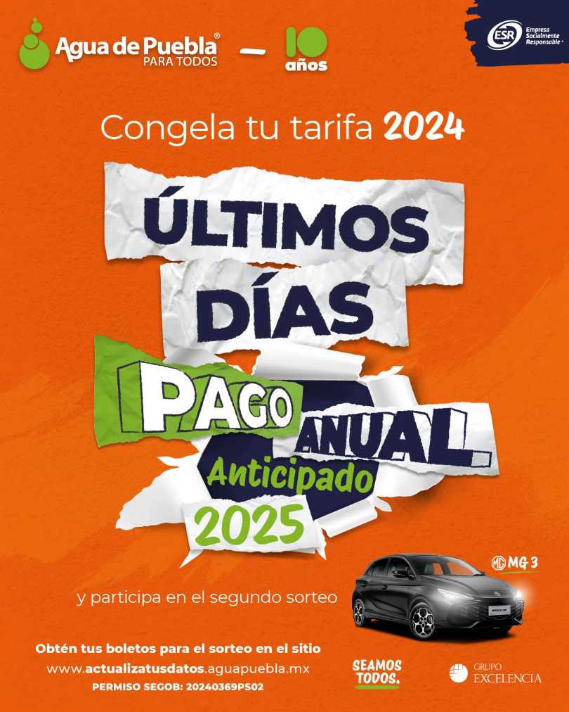 Agua de Puebla para Todos informa que el próximo viernes 31 de enero es el último día para realizar el Pago Anual Anticipado con tarifas congeladas del 2024 para todo este año 2025, sin incremento alguno, por lo que No habrá más prórroga de este beneficio.