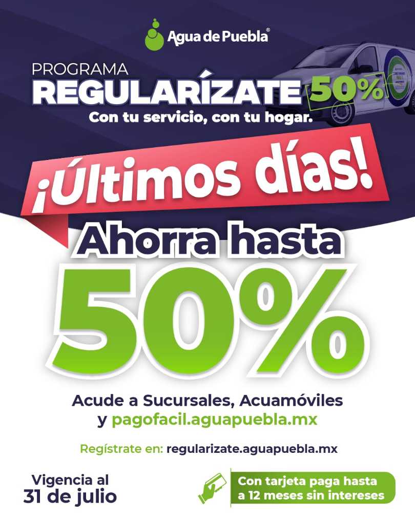Agua de Puebla informa que el próximo jueves 31 de julio es el último día para aprovechar los grandes beneficios del Programa Regularízate, con ahorros hasta del 50% al liquidar su adeudo de los servicios de agua potable, drenaje y saneamiento.