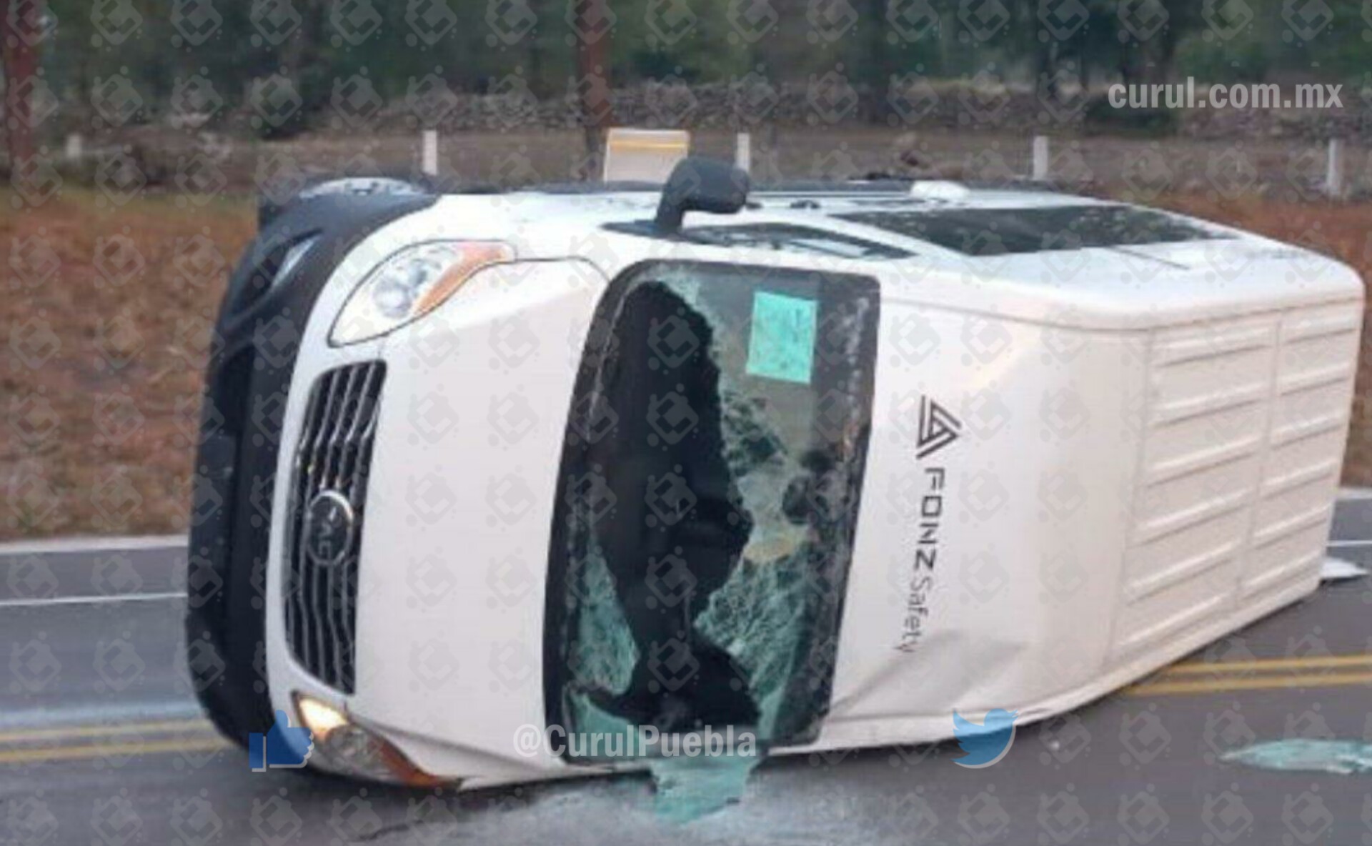 Una camioneta de pasajeros tipo VAN, volcó en el kilómetro 12 de la autopista Amozoc-Perote, en el vehículo iban 10 bomberos de una empresa privada que dan el servicio a la planta de autos premium, Audi de México.
