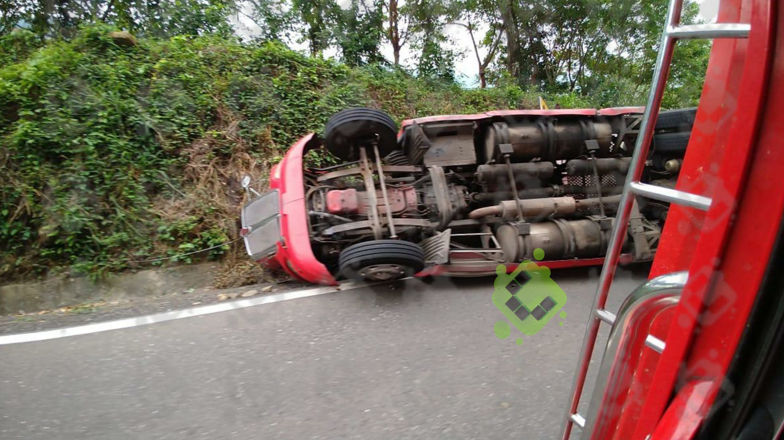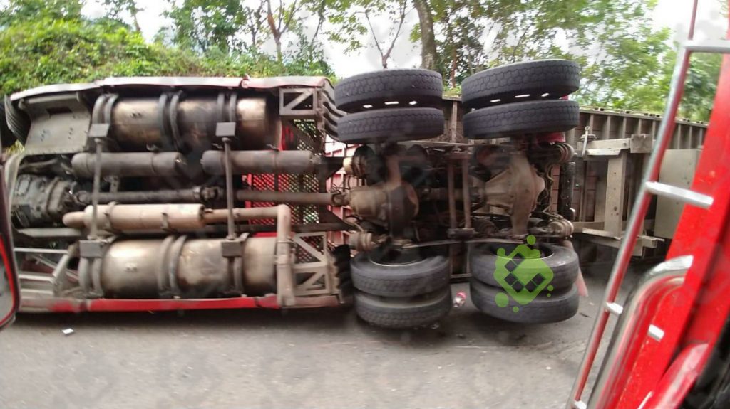Daños materiales por miles de pesos dejó la volcadura de un tráiler cargado con 30 toneladas de maíz, ocurrida sobre la carretera federal México-Tuxpan.